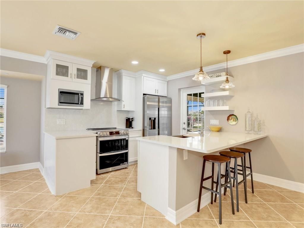 AVAILABLE APRIL 1ST. Beautifully remodeled pool home in Bonita Springs. This home comes fully furnished. Quiet and secluded 3 bedroom with an amazing lake view. This home has all new flooring, new kitchen and new bathrooms. The new kitchen features, quartz counter tops, stainless steel appliances and white cabinets. Tile flooring in the kitchen and dining areas, new vinyl floors in the great room and bedrooms. Large screened lanai, pool and lake view to watch the sunsets.