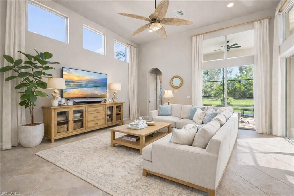Discover the exquisite Diplomat floorplan at Belle Lago, situated on OVER HALF AN ACRE and boasting over 4,300 sf. of living space with 5 bedrooms, a private office, 3-car garage, and stunning features throughout! Soaring 22 ceilings in the living room and 16 ceilings in the family room add to the wow factor and spacious feel of this home. FIRST FLOOR master suite and an additional guest suite offer convenience and comfort. Upgrades abound, including newer roof (2018), newer A/Cs, NATURAL GAS WH...Discover the exquisite Diplomat floorplan at Belle Lago, situated on OVER HALF AN ACRE and boasting over 4,300 sf. of living space with 5 bedrooms, a private office, 3-car garage, and stunning features throughout! Soaring 22 ceilings in the living room and 16 ceilings in the family room add to the wow factor and spacious feel of this home. FIRST FLOOR master suite and an additional guest suite offer convenience and comfort. Upgrades abound, including newer roof (2018), newer A/Cs, NATURAL GAS WHOLE HOUSE GENERATOR, white cabinetry, stainless steel appliances, double oven, custom wine bar, crown molding, and a private pool & spa with a summer kitchen and pool bath. Nestled on one of Belle Lagos largest lots—the outdoor living space is your own private oasis, perfect for relaxing or entertaining guests. Belle Lago Residents enjoy a variety of amenities including tennis courts, bocce ball, pickleball, fitness center, billiard and card rooms, resort style pool and spa, basketball court, and a scenic walking path through Belle Lagos nature preserve. OPTIONAL MEMBERSHIPS and ARE AVAIALBLE AT NEIGHBORING Estero Country Club, conveniently connected by a golf cart path. Conveniently located between Naples and Ft. Myers with quick access to Coconut Point Mall, RSW Airport, Hertz Arena, and the beautiful Gulf Beaches! A move-in ready home this size with a 3-car garage, large lot and central location is a rare find! Do not miss the opportunity to make 19260 La Serena your home in paradise! Schedule a private showing today! Flood Zone X **Some photos in this listing have been virtually staged to illustrate the potential use and layout of the space. Furnishings and décor shown are for illustrative purposes only and are not included in the sale.**