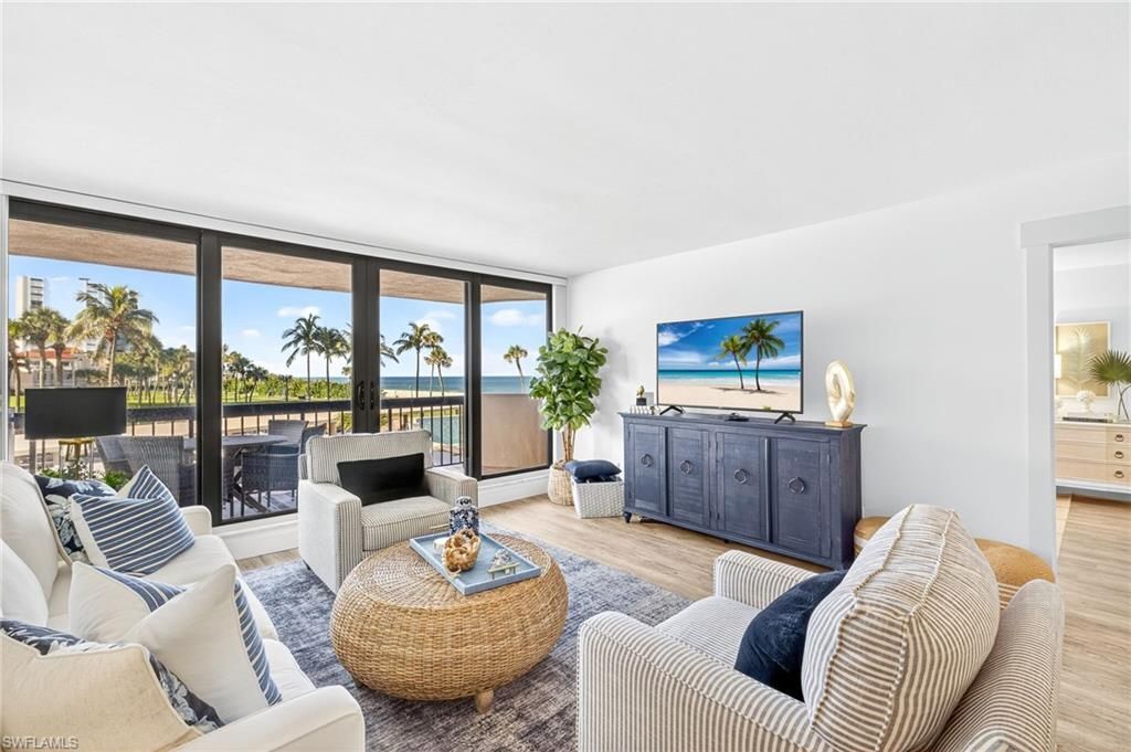 This beautifully remodeled and renovated 2 bedroom 2 bath condo has endless southern views of the Gulf beaches in the Park Shore neighborhood of Naples, FL. Enjoy all of the comforts of home while gazing out at the dolphins playing in the water or watching sunsets over the Gulf. Surfsedge has been totally transformed in the past year with a new lobby, social room, and two guest suites. The exercise room faces directly west and has a mesmerizing view of the Gulf waters. The new large pool and spa...This beautifully remodeled and renovated 2 bedroom 2 bath condo has endless southern views of the Gulf beaches in the Park Shore neighborhood of Naples, FL. Enjoy all of the comforts of home while gazing out at the dolphins playing in the water or watching sunsets over the Gulf. Surfsedge has been totally transformed in the past year with a new lobby, social room, and two guest suites. The exercise room faces directly west and has a mesmerizing view of the Gulf waters. The new large pool and spa have water fountains and water fall features that are mesmerizing. The fire pit has also been added for the enjoyment of residents. SURFSEDGE is a short stroll across the boulevard to a variety of shops and restaurants on Venetian Bay. It is a short drive to Waterside Shops, The Artis, Old Naples, the Botanical Gardens and a whole host of activities for the entire family to enjoy. Rentals are 90 days minimum per the association.